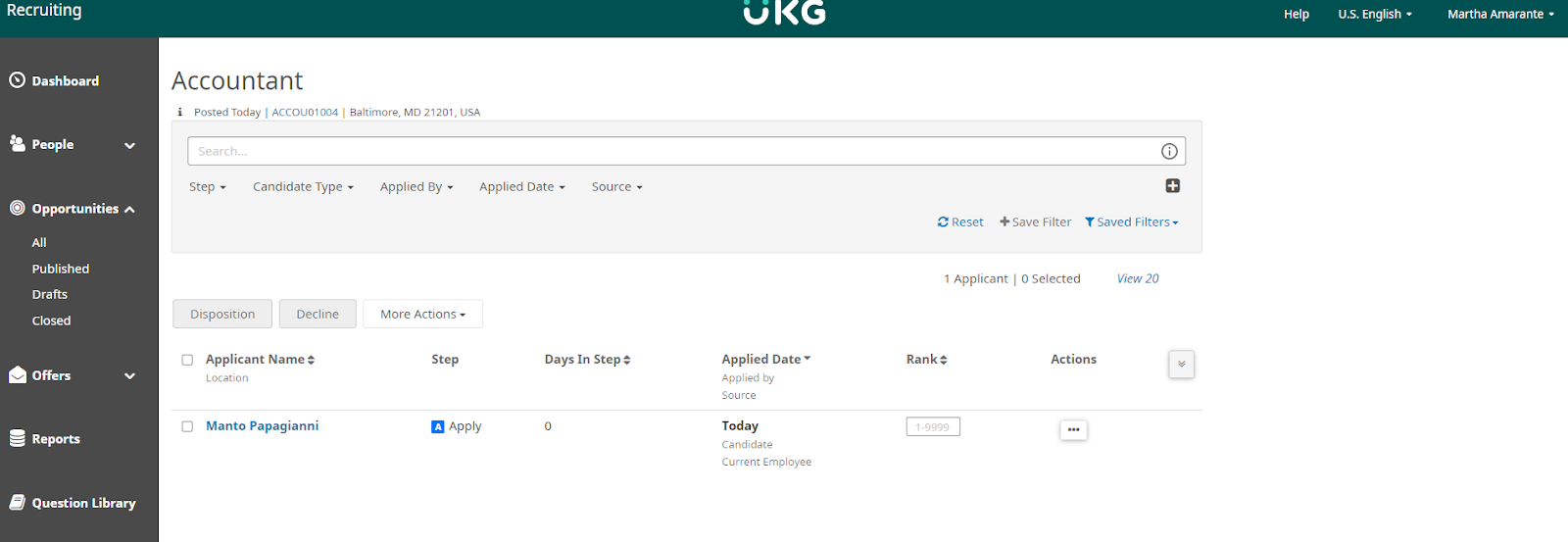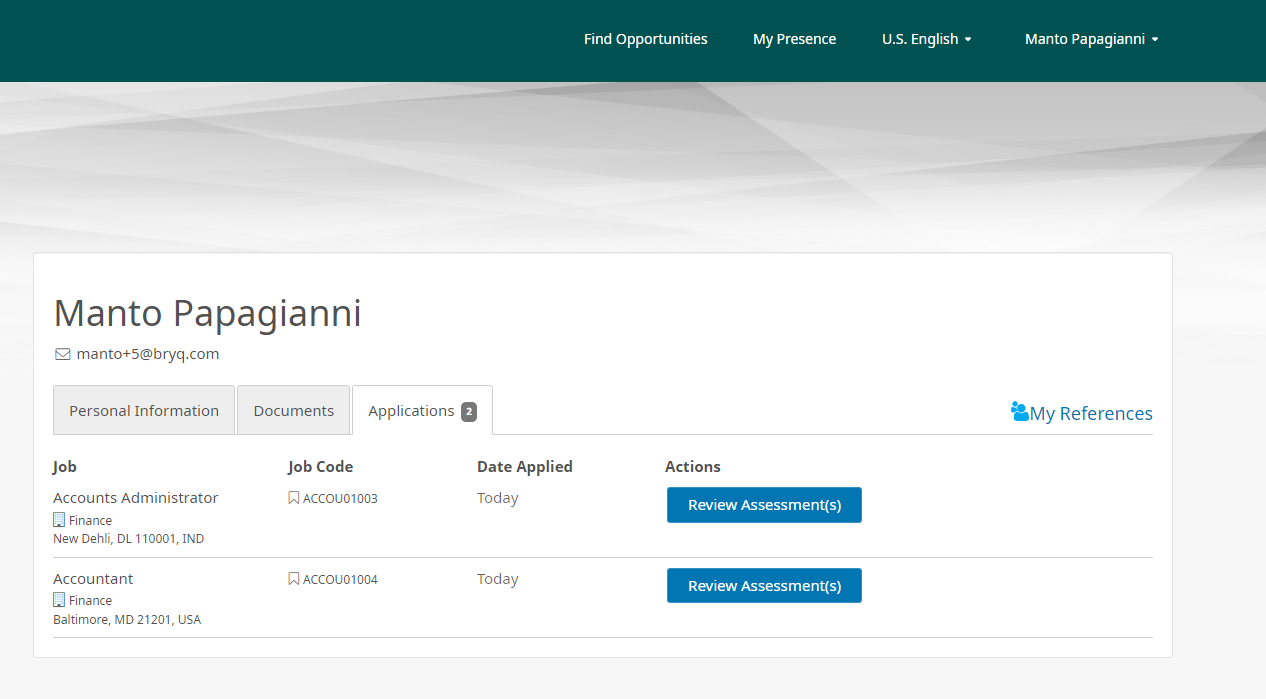 Going back to the UKGCareer portal under Applications, the candidate can view the Application status.
