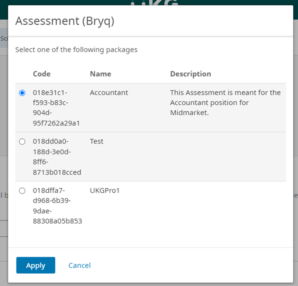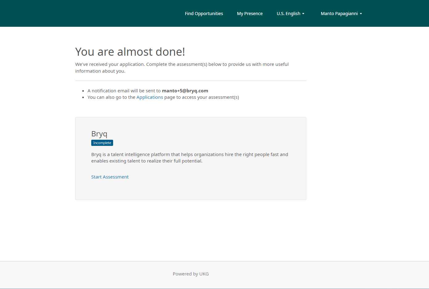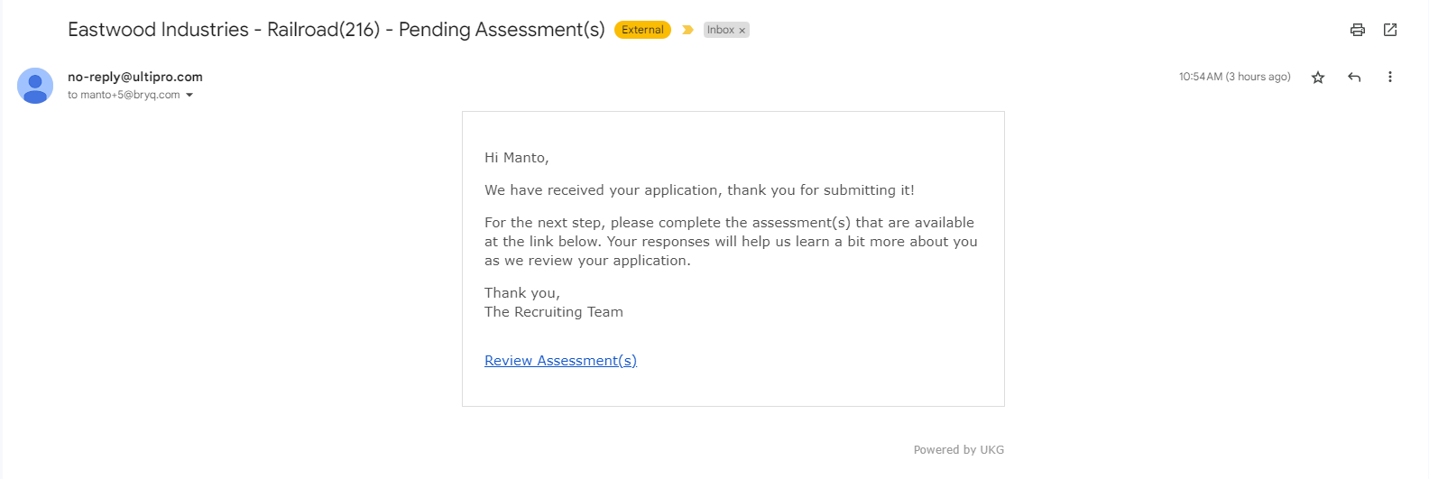 Note: An email will be sent to the candidate via UKG with the link to the Assessment(s):