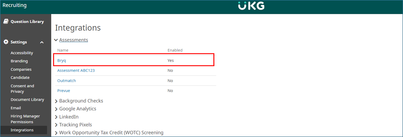 As a first step, the Recruiter/HR Admin should verify that the Bryq integration is enabled in UKG Pro Recruiting.